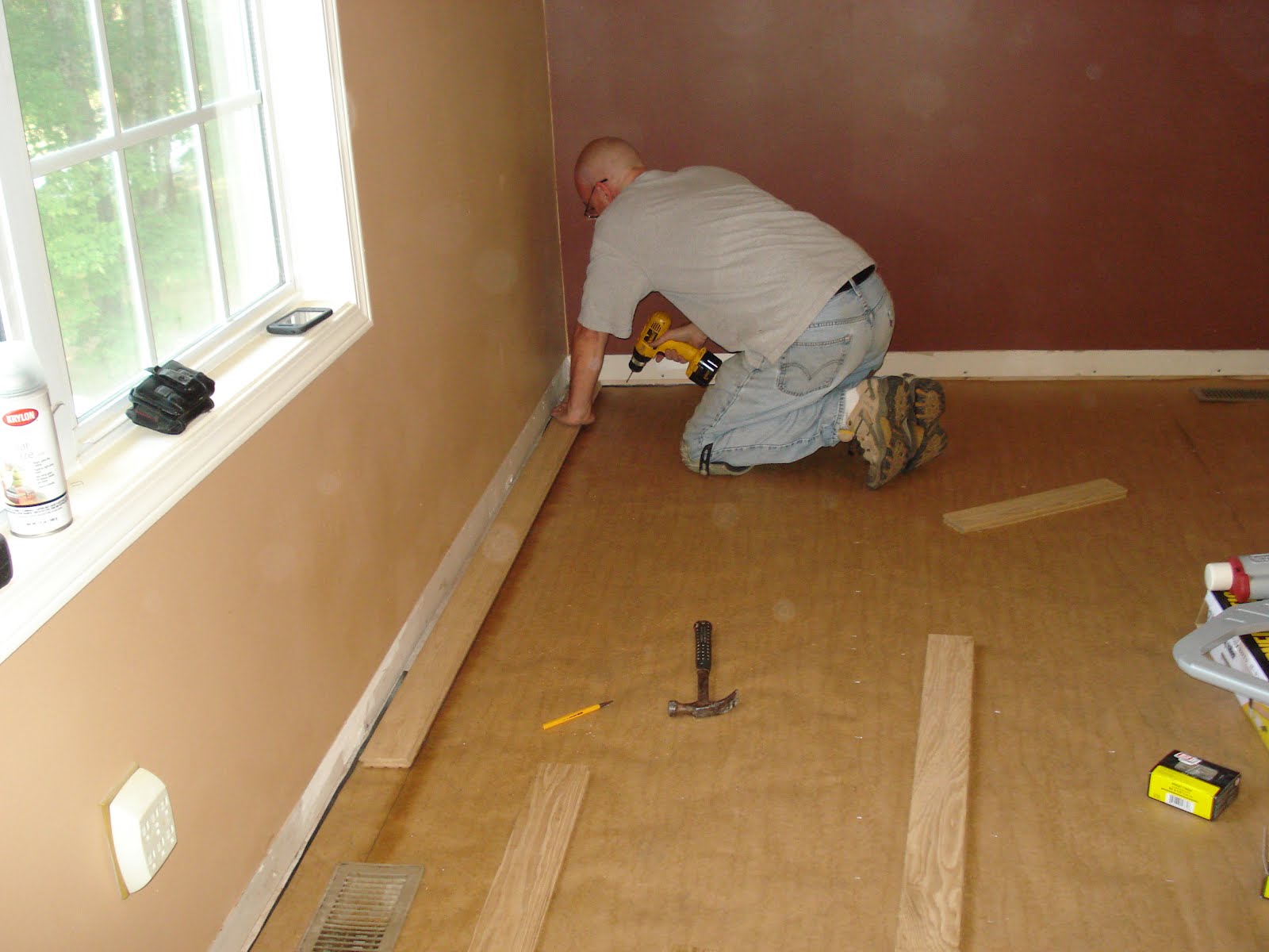 Had a really productive day....We are close to the finish line....The flooring lined up great thru the door from the bedroom to the living room. I hope we can finish it tomorrow.